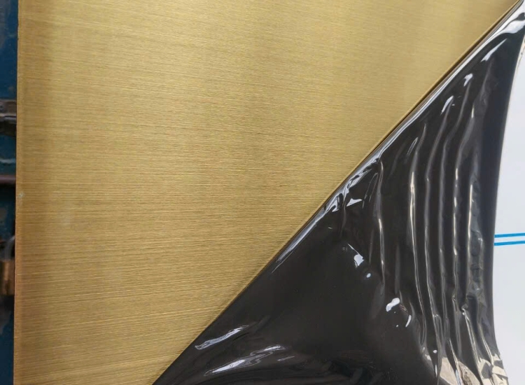 Tấm Inox xước vàng được biết đến là loại inox có màu vàng mà trên bề mặt inox xuất hiện các đường nét mài xước đồng đều, đường xước mịn màng và có đường kính rất nhỏ như sợi tóc. Các đường xước này xuyên suốt theo chiều dài của cuộn inox hoặc tấm inox, nhằm mục đích tạo thành những sản phẩm inox vàng xước theo dạng line nhuyễn chân tóc trên bề mặt tấm inox. Loại Inox xước này còn có tên gọi khác phổ biến là inox sọc hoặc inox xước hairline.